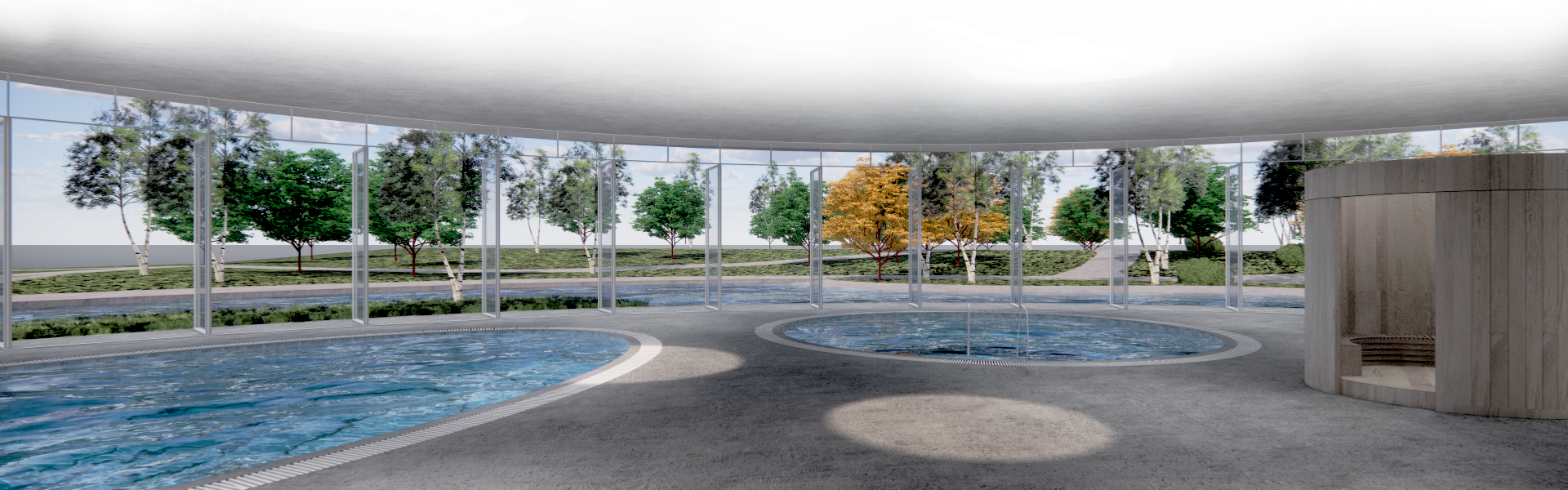 Outside the panoramic glass door is the engawa veranda, inspired by Japanese traditional house construction, where people can sit and relax. It is viewed as a place that brings the outside inside and blurs the boundary between nature and architecture, allowing people to paddle the pool outside. It completes this therapeutic journey.
